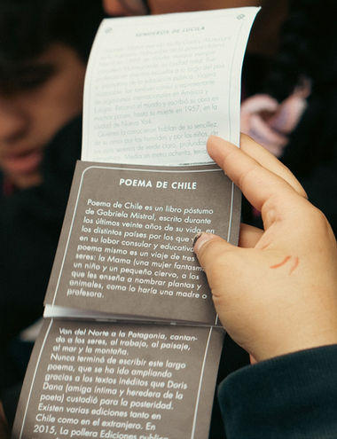 En este taller se trabaja con un material de apoyo sobre Gabriela Mistral, en el que se introducen aspectos relevantes respecto a la vida y obra de la poeta. El taller consiste en intervenir poemas seleccionados del libro Poema de Chile, siguiendo una lógica territorial: cada región está representada por poemas específicos. Los participantes son divididos en grupos según el poema que les toque. Deberán recortar cada verso del poema y luego reordenarlo siguiendo tres criterios: de la A a la Z, de la Z a la A, y de forma aleatoria. El resultado es un ejercicio de escritura potencial que hace del participante un agente activo en la realización de distintas posibilidades de poemas, jugando con la figura de la autoría.
